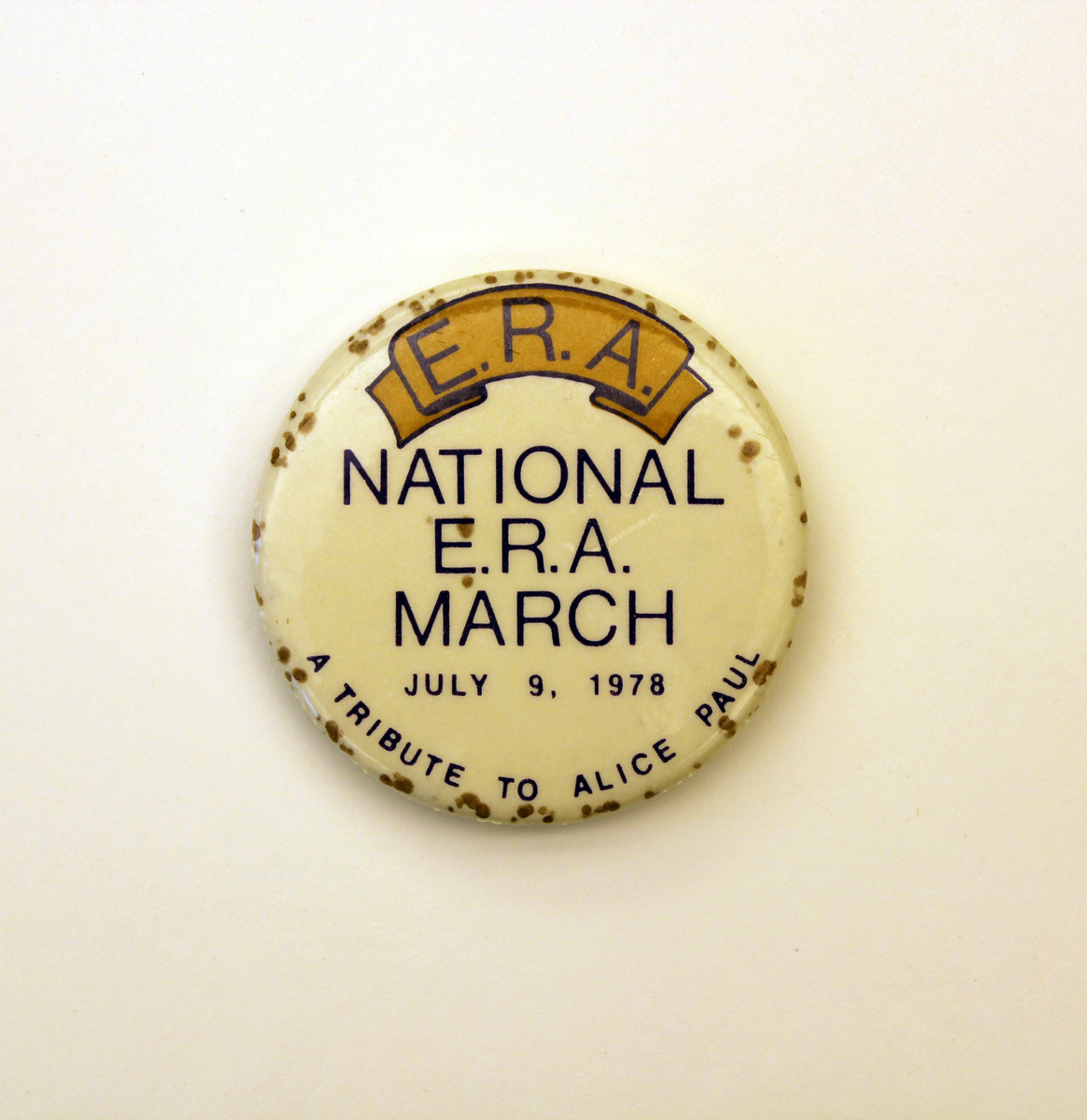 Round metal button with pin and catch on reverse. Paper front with white background and purple lettering, "E.R.A./NATIONAL/E.R.A./MARCH/JULY 9, 1978/A TRIBUTE TO ALICE PAUL." Top "E.R.A." is set in gold banner. Paper attached to button with plastic laminate.