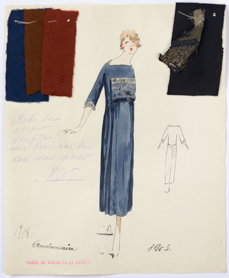 Lithograph and watercolor on paper fashion design. Dress of soft serge with embroidery of silk on steel. Fabric samples accompany rendering.