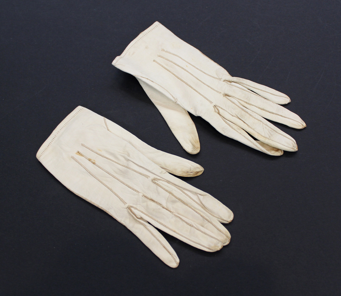 Pair of white leather child's gloves; three rows of stitching on top; metal closure at opening with silk braid