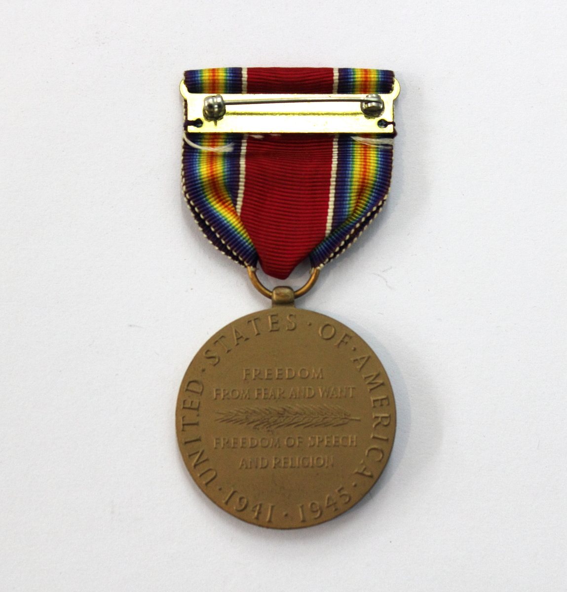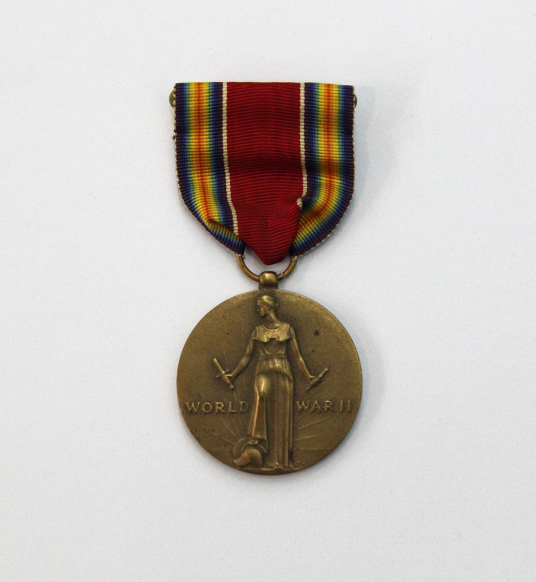 Round bronze metal, silk ribbon and metal pin. Ribbon has red base with rainbow and white stripes. On obverse of medal, relief depicts figure with dress, breastplate and laurel wreath holding one half of a broken sword in each hand. The figure's right foot is resting on a helmet with the sun partially visible in the background. On the left side of the figure is the word "WORLD" and on the right "WAR II". At the base of the figure's left foot is a small inscription "TJ". On the reverse there is a circle of text around the rim that reads "UNITED*STATES*OF*AMERICA*1941*1945". Inside the circle in the center is a palm frond with text above that reads "FREEDOM/FROM FEAR AND WANT" and text below the frond "FREEDOM OF SPEECH AND RELIGION". World War II victory medal.