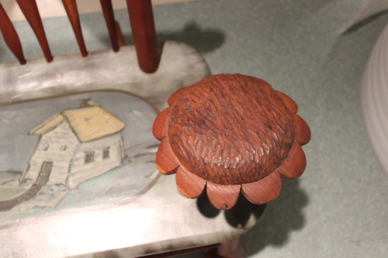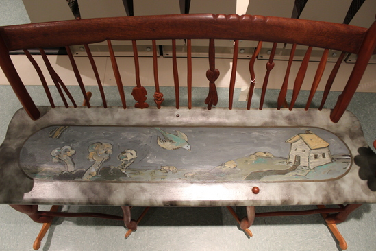 Wooden rocking bench. Seat painted with a scene with a bird in center, a small white clapboard house on the right, and three trees on the left. The remainder of the rocker is natural wood. Large sunflowers are carved on the front corner of the bench. Rocks rails and back seat rails fancifully carved.