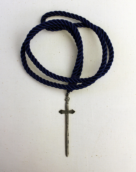 Dark blue braided rope with satin ribbon twist at end. Metal loop at end of rope attached to a metal emblem. Emblem shaped like fraternal sword with stamped decoration on front.