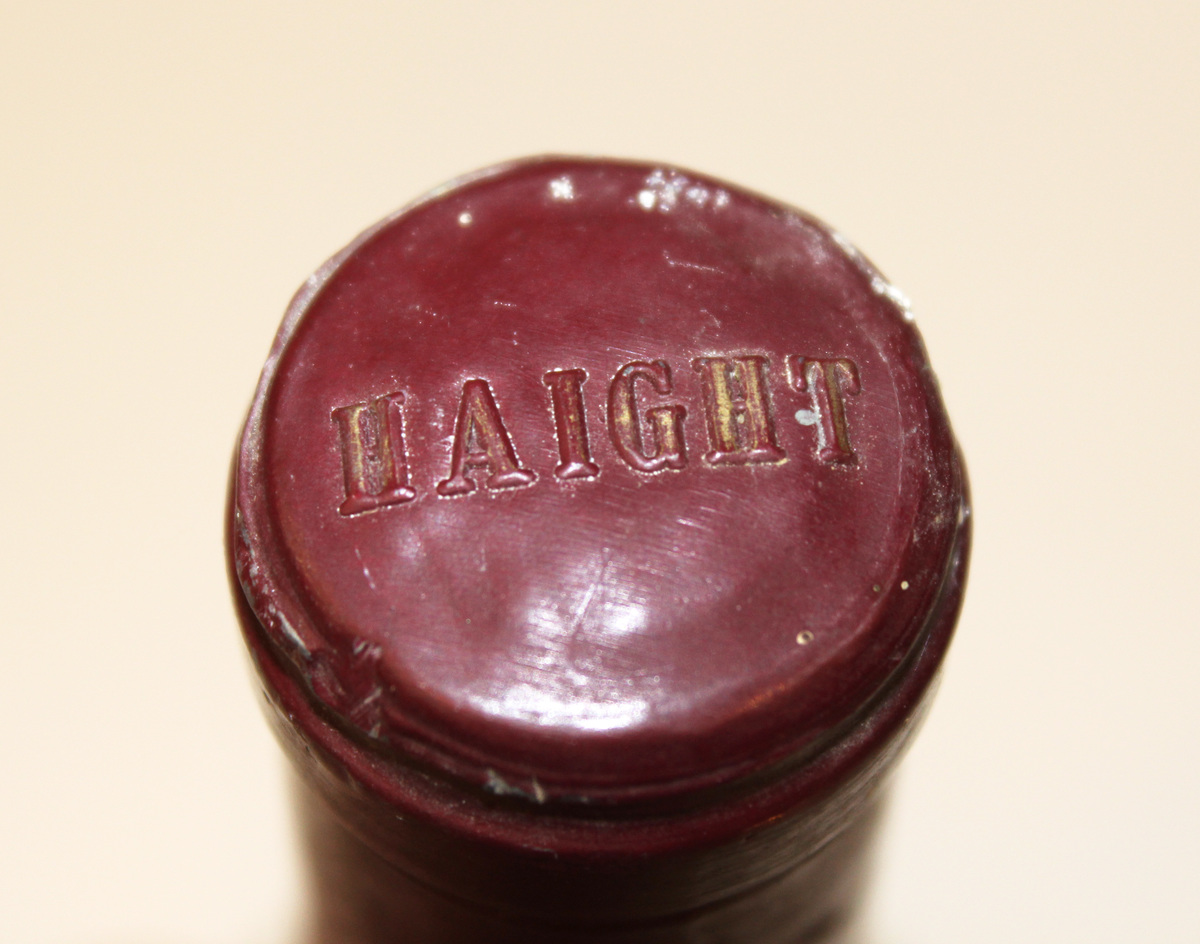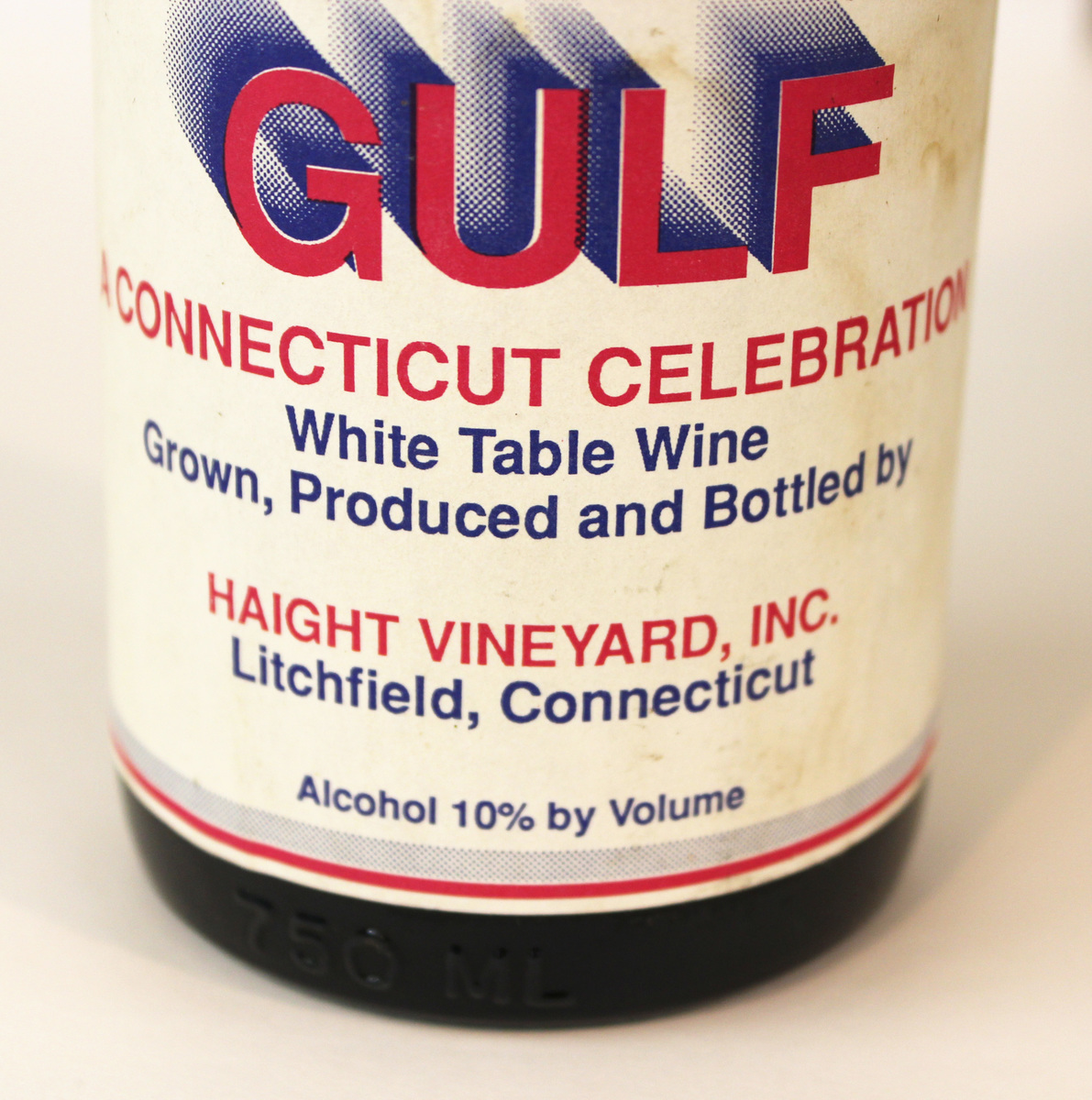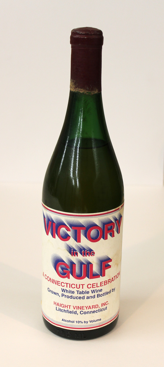 Sealed glass wine bottle containing white wine produced by Haight Vineyard, Litchfield, Connecticut. Green-colored glass bottle with round base, tapering at top. Rectangular, white paper wine label with red and blue printed text, "VICTORY/IN THE/GULF/A CONNECTICUT CELEBRATION/White Table Wine/Grown, Produced and Bottled by/HAIGHT VINEYARD, INC./LITCHFIELD, CONNECTICUT." Label also includes required statements of sale, government warning, and alcohol content. Tin capsule with red coloring, embossed lettering on top, "HAIGHT." Maker's mark on bottom of bottle.