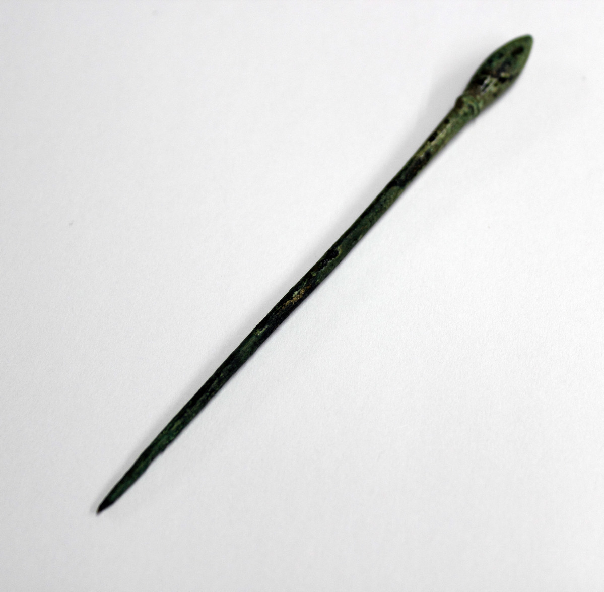Bronze stiletto or pin. Single-piece bronze rod, tapering to a point; oblong head at other end, with grooved lines underneath.