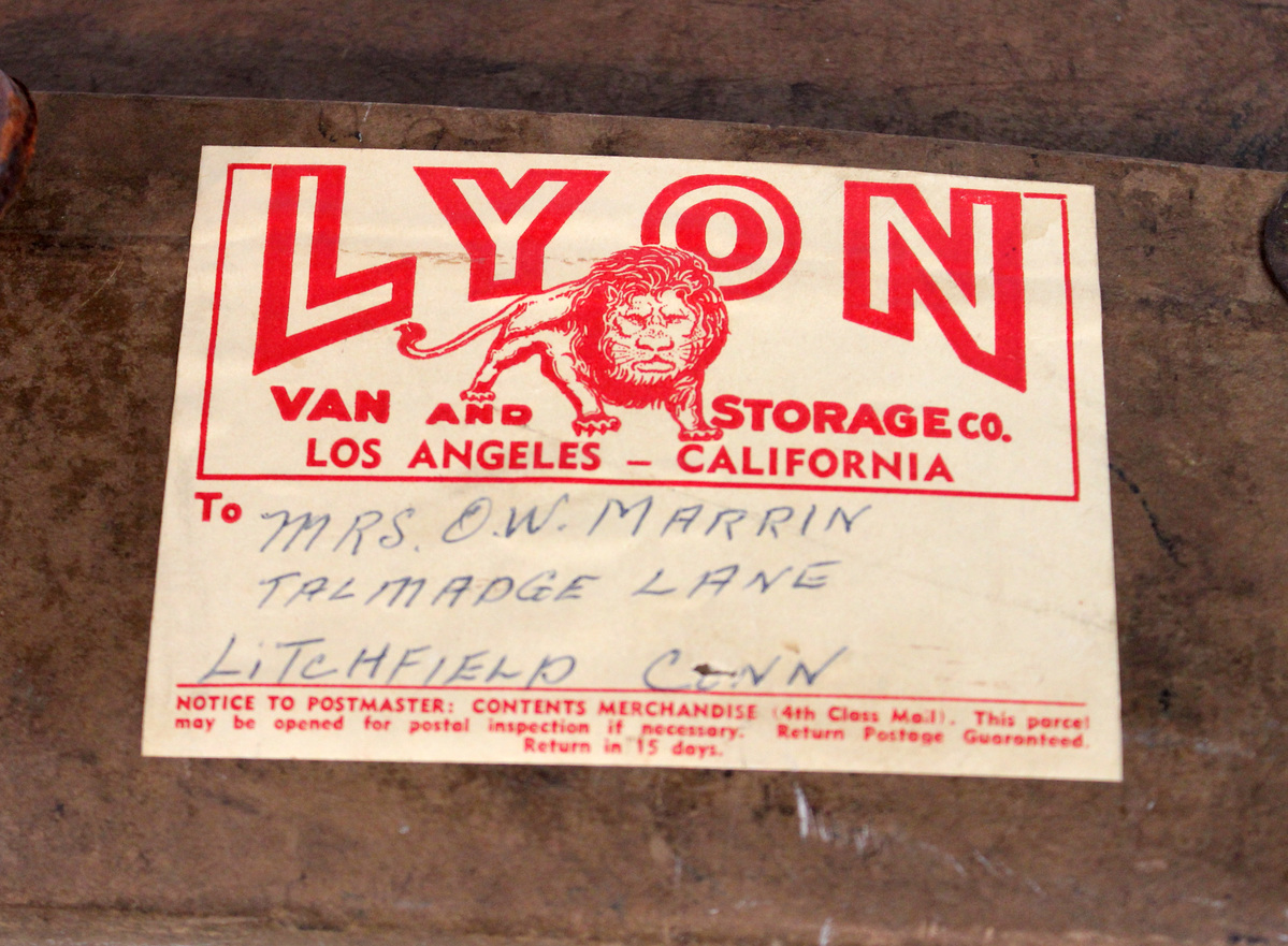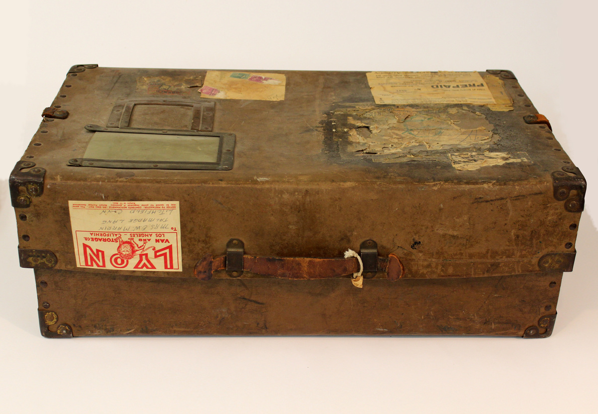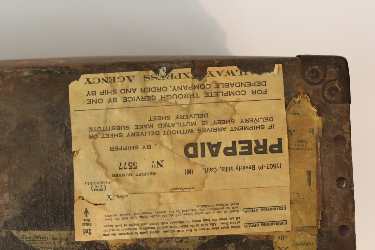 Rectangular laundry case or mailer produced by Fiberco under the "Laundripak" name. Heavy fiberboard case (a) with lid (b), with metal corner plates and metal fasteners along the edges. Brown fiberboard with numerous postage and address remnants on the lid. Empty plastic document windows at top-right of lid; at top-left, multiple layers of shipping labels in various states of completeness, one of them for the Railway Express Agency; at bottom-left, a mostly-complete label for the Railway Express Agency marking the container as prepaid and providing a receipt number, but no address; at bottom-right, three stamps (two 25-cent stamps with likeness of President McKinley, one 13-cent stamp with likeness of President Fillmore) and a manufacturers label, "FIBERCO/[ ]IPACK" with an image of the laundry box. On the back edge of the lid, white label with red text, "LYON/VAN & STORAGE CO./LOS ANGELES - CALIFORNIA" with image of red lion and handrwitten address, "MRS. O. W. MARRIN/TALLMADGE LANE/LITCHFIELD CONN." Leather straps on the left and right side of the case are incomplete; leather handle on rear of case intact.