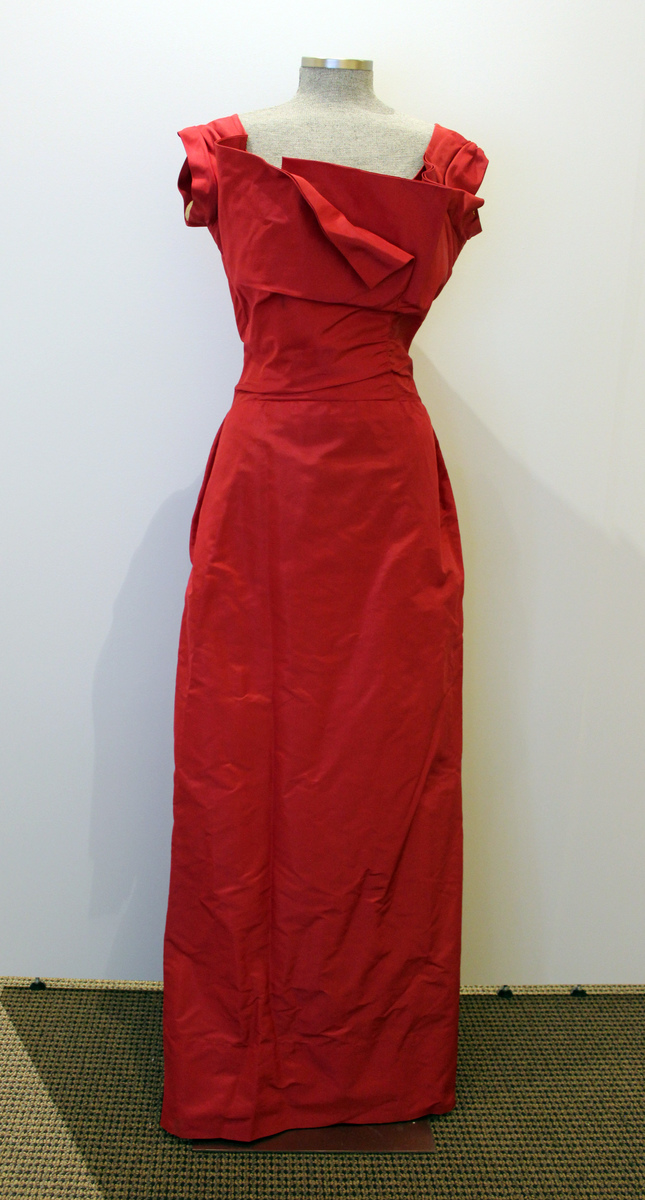 Red satin dress with straight silhouette and long length. Off-the-shoulder neckline. Bodice with pleat detail and asymmetric ruching. Cap sleeves. Zipper at center-back. Attached train on skirt. Dress shields sewn in.