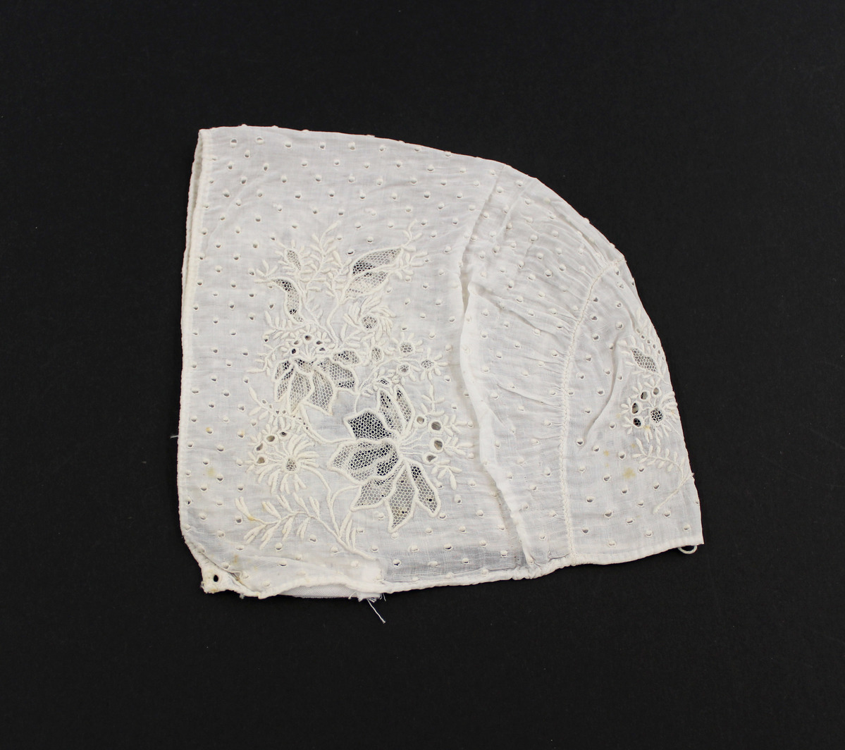 White sheer cotton child's bonnet; holes and floral embroidery with net needle fillings; center back curved section; drawstrings at front and center back