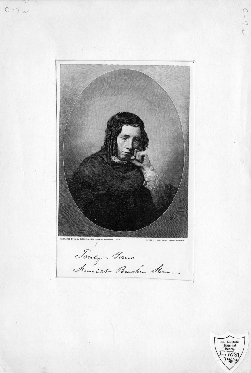 Engraving of Harriet Beecher Stowe. Bust pose, 3/4 face with hand at face as though thinking. Below portrait, lettering "ENGRAVED BY R.G. TIETZE, AFTER A DAGUERREOTYPE, 1852. OWNED BY MRS. HENRY WARD BEECHER." Below that reproduction of signature in script, reading, "Truly yours/ Harriet Beecher Stowe."