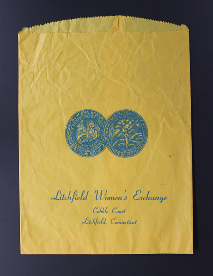 Rectangular yellow paper shopping bag. No handles. Double circle image of town seal and 250th anniversary seal printed in blue in center of bag. "Litchfield Women's Exchange/ Cobble Court/ Litchfield, Connecticut" printed in blue below image.