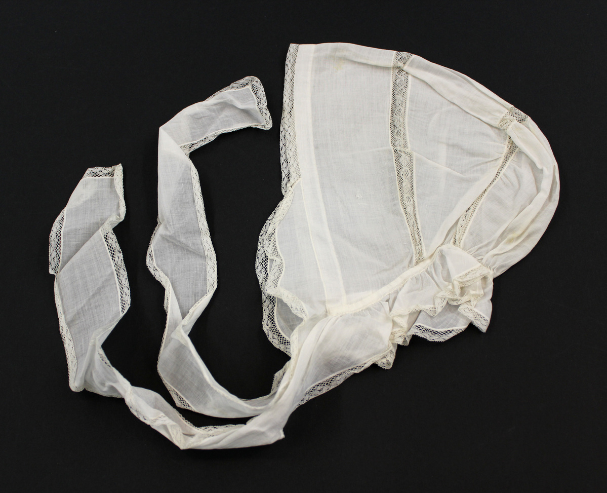 Off-white sheer cotton child's bonnet; gathered back section; two lace insertions; lace at front edge; neck ruffle forms ties with lace edges