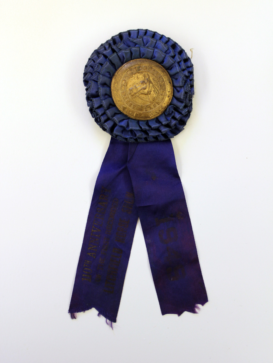 Purple and blue satin ribbon with rosette of blue satin at top, circular metal button in center. Metal button has raised image of a horse's head surrounded by text, "LITCHFIELD/HORSE SHOW." Two purple satin tails extending below rosette. Left tail stamped with gold lettering, "110th ANNIVERARY/OF THE FIRST RECORDED/LITCHFIELD HORSE SHOW." Right tail stamped with gold lettering, "1949." Metal hook on reverse of rosette with yellow paper label.