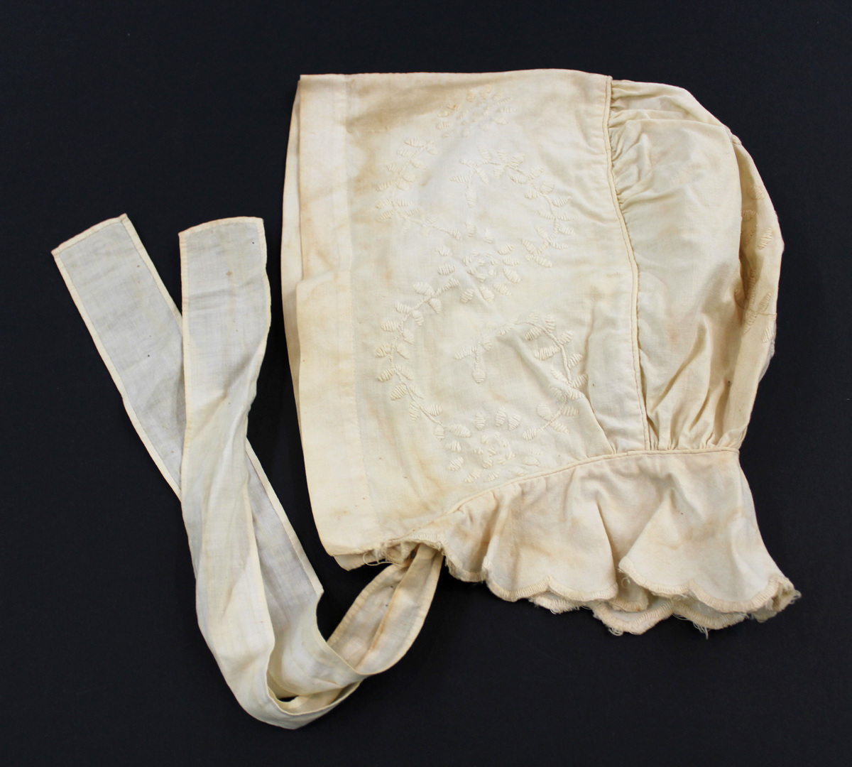 Off-white cotton child's bonnet; embroidery on side and back; piping; embroidered scalloped ruffle at neck; fabric ties