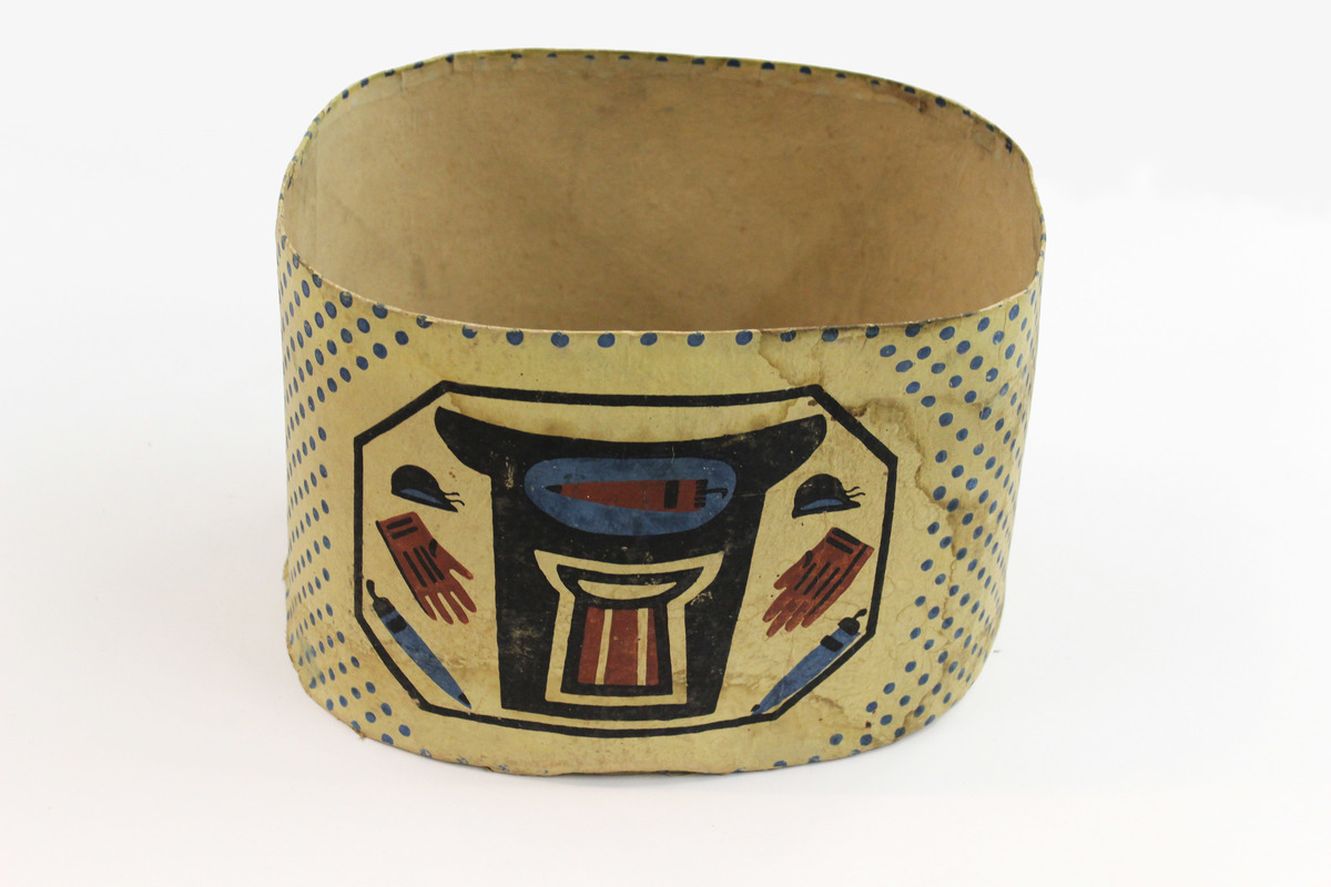 Oval board box covered with block printed or painted wallpaper. Yellow paper printed with blue polka dots. On each side is an octagonal panel outlined in black and containing a black top hat shape surrounding an umbrella and striped top hat, with vertical groupings on either side containing a riding cap, glove, and umbrella. Inside of box lined with white paper. Bottom of box lined with cut newspaper, likely added at a later date. The box top is covered with a different block printed paper, with red and green floral and geometrical patterns on yellow ground.
