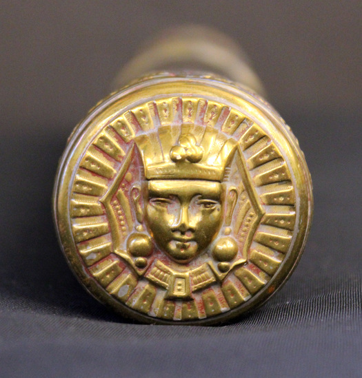 White silk Masonic apron with light blue silk ruffle border. Apron backed in linen. All seeing eye painted in muted colors on flap. Protector, square and "G" painted in gold on body of apron. Brass cylindrical tube used for storing a rolled Masonic apron. Tube pulls apart in middle into two sections. Each end decorated with stamp work producing decoration reliefed from the base surface. Stamp work decoration around middle portion of case. One end decorated with a face adorned in an Egyptian style hat and jewelry.