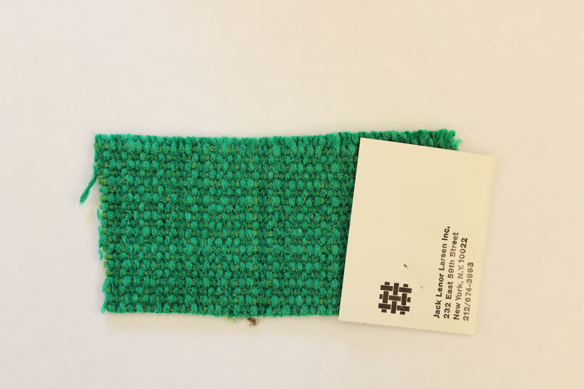 Fabric swatch for the upholstery in Mr. Hart's office from a decoration job for the first National Bank. This item came in with a larger collection of materials related to interior design projects of Nan F. Heminway.