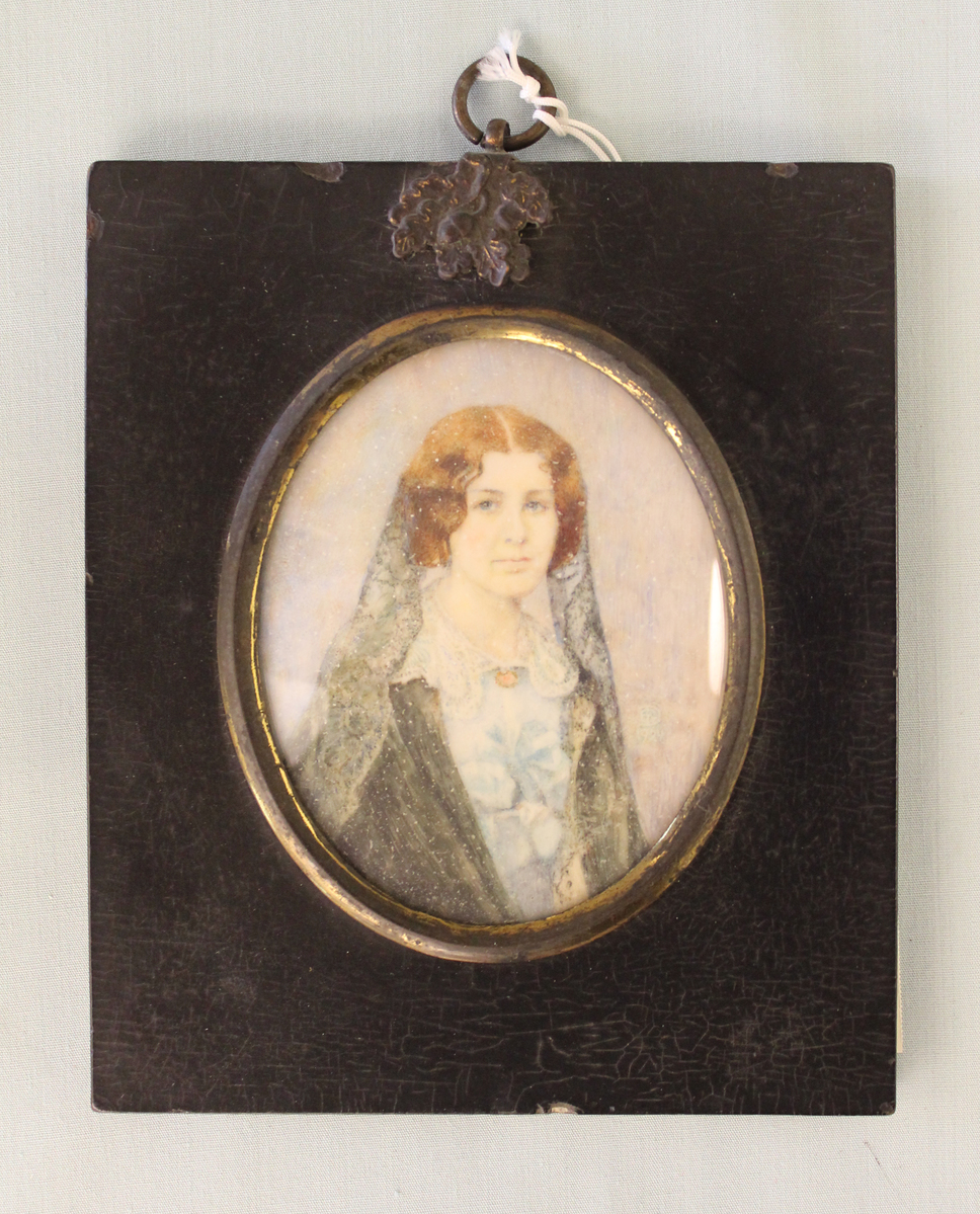Watercolor portrait miniature in wooden frame painted black. Portrait shows a woman with chin length red hair. Sitter is wearing a blue dress with white collar, black shawl, and a veil covering the back of her head.