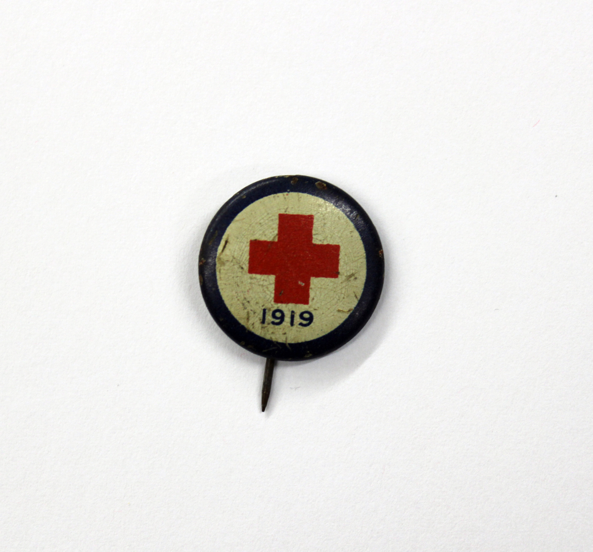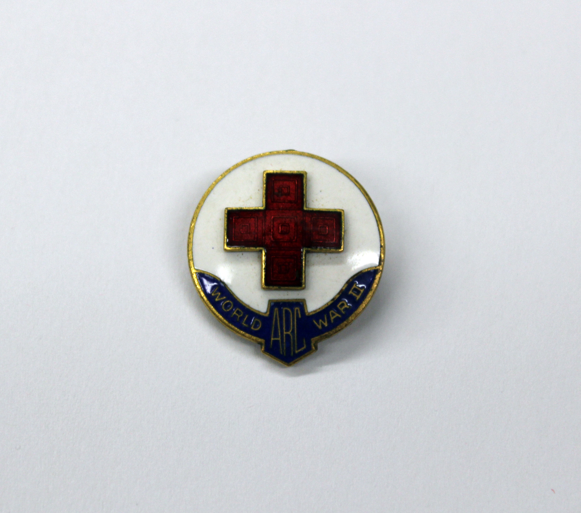 Pair of American Red Cross pins or buttons. A - Round metal pinback button. Red Cross emblem in white circle with blue border and "1919" printed underneath. B - Round gold metal pin. Raised Red Cross emblem of metal and red enamel on a background of white enamel. At the bottom is a ribbon of blue enamel with gold letting "WORLD/ARC/WAR II."