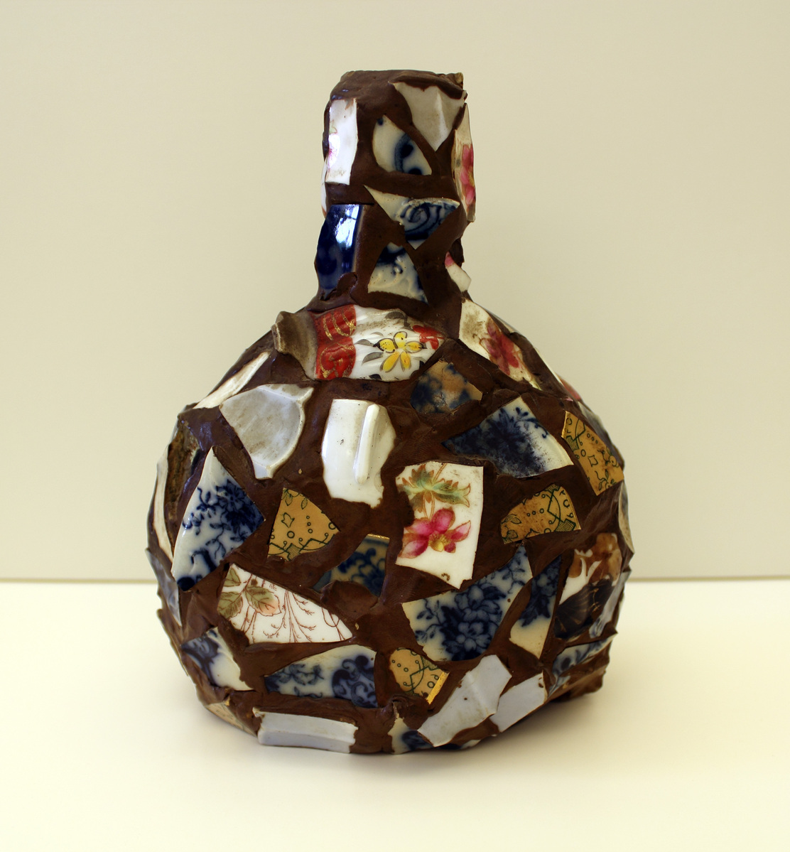 Memory vessel or jug made from mixed media and clay applied to an amber glass apothecary jar. Jar has an oval bottom, wide shoulders, and short neck. A thick layer of dark brown clay covers the outer surface of the bottle; bottom is uncovered. Pressed into the clay are fragments of ceramic goods, including blue and white ware, transfer-printed floral porcelain, the head of a ceramic pig (front side), and the handle of a toy teacup (rear side).