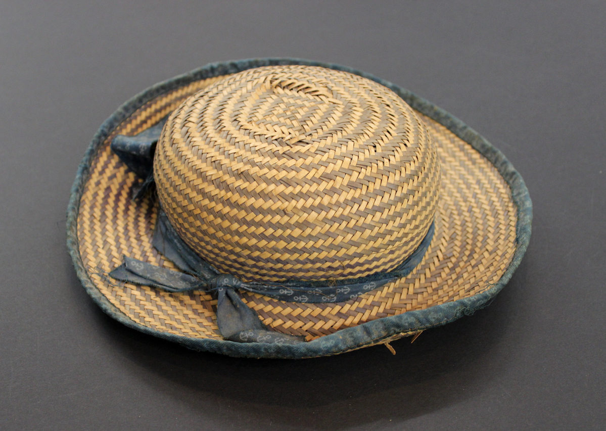 Tan and teal blue straw child's hat; curled brim; teal blue cotton twill band with printed white anchors; tan elastic band for under the chin