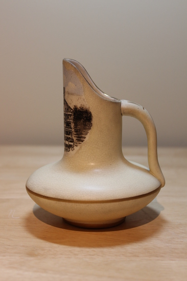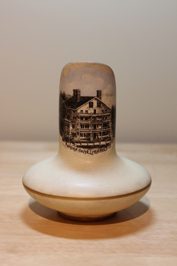 Small, glazed porcelain souvenir pitcher. Body of pitcher is flat round with a small foot. Neck is cylindrical with diagonal spout. Curved handle stretches from black of neck to back of body. Pitcher is beige with painted gold trimmings. Front of pitcher has a transfer under glaze image in blue, white, and black of a four-story building with two chimneys and multi-floor front porch. "MANSION HOUSE, LITCHFIELD CT." printed at bottom of image.