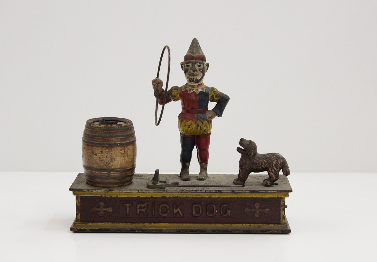 Cast iron mechanical bank featuring a dog, a circus performer with a hoop, and a barrel. Rectangular base, 1.75" tall, with raised lettered on front reading "TRICK DOG," painted red with yellow border. On top of the base is a small dog attached to a lever and spring mechanism that carries coins through the hoop held by a performer in red, yellow, and blue costume. The coins are then dropped in the brown barrel. Marked underneath base "PAT. July 31, 1888." The mechanism is visible through holes in the bottom plate. Coin slot is on top of the barrel.
