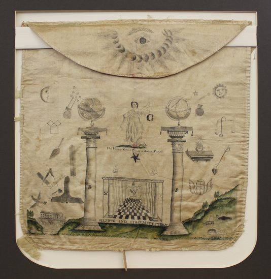 This masonic apron was likely home made. Copied from an engraving. The donor's husband was a member of St. Paul's Masonic Lodge in Litchfield, CT.