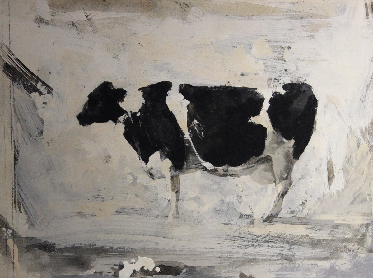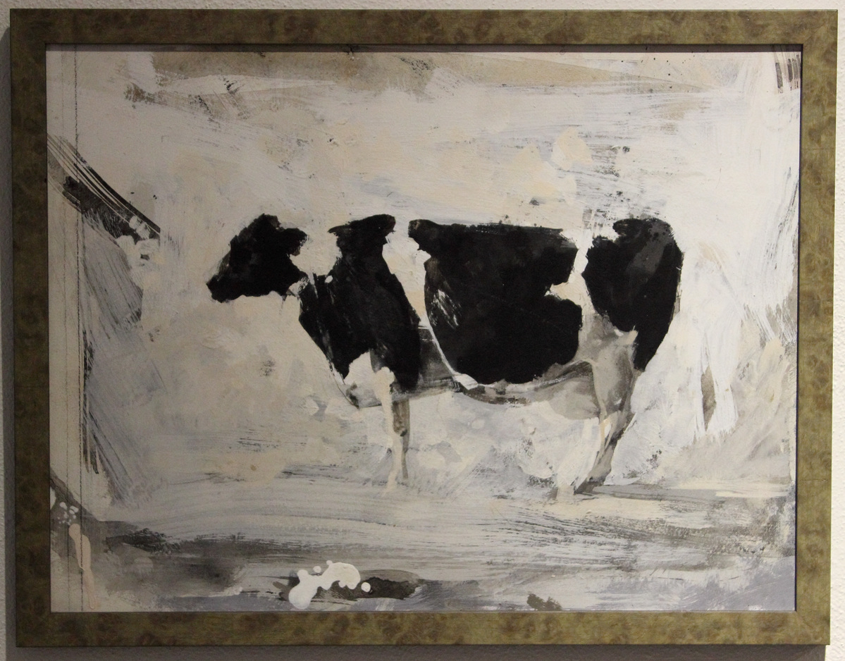 Oil on canvas panel painting of a cow, completed in an abstract style. Black and white cow (likely a Holstein) in profile against a white background. Upper part of the cow's body is largely defined by its black markings, with the white areas continuing seamlessly from the white background. The lower parts are more clearly defined using washes of grey paint. Background is completed in white with areas of grey, beige, and black, with brush strokes visible throughout. Painting framed in rectangular wood frame with marbled design. Artist's adhesive label on reverse.