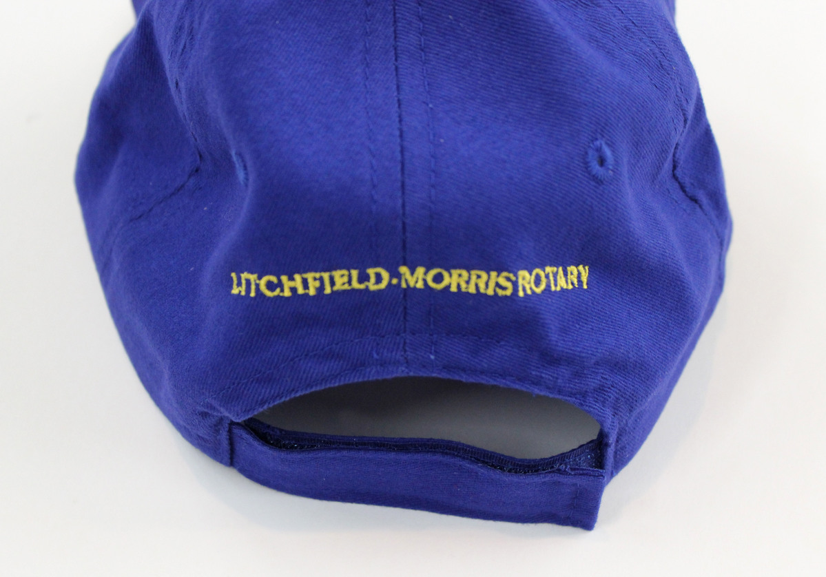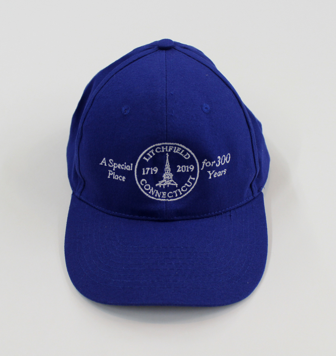 Royal blue, cotton baseball cap (hat). Slightly curved brim, adjustable Velcro size strap. Embroidered at center-front, in white, text "A Special/Place" and "for 300/Years" on either side of Litchfield's 300th Anniversary logo: image of the First Congregational Church steeple with text, "Litchfield/1719/2019/Connecticut" set inside thin circle. Embroidered at center-back, in yellow, "LITCHFIELD-MORRIS ROTARY." Maker and materials tags attached to inner lining.