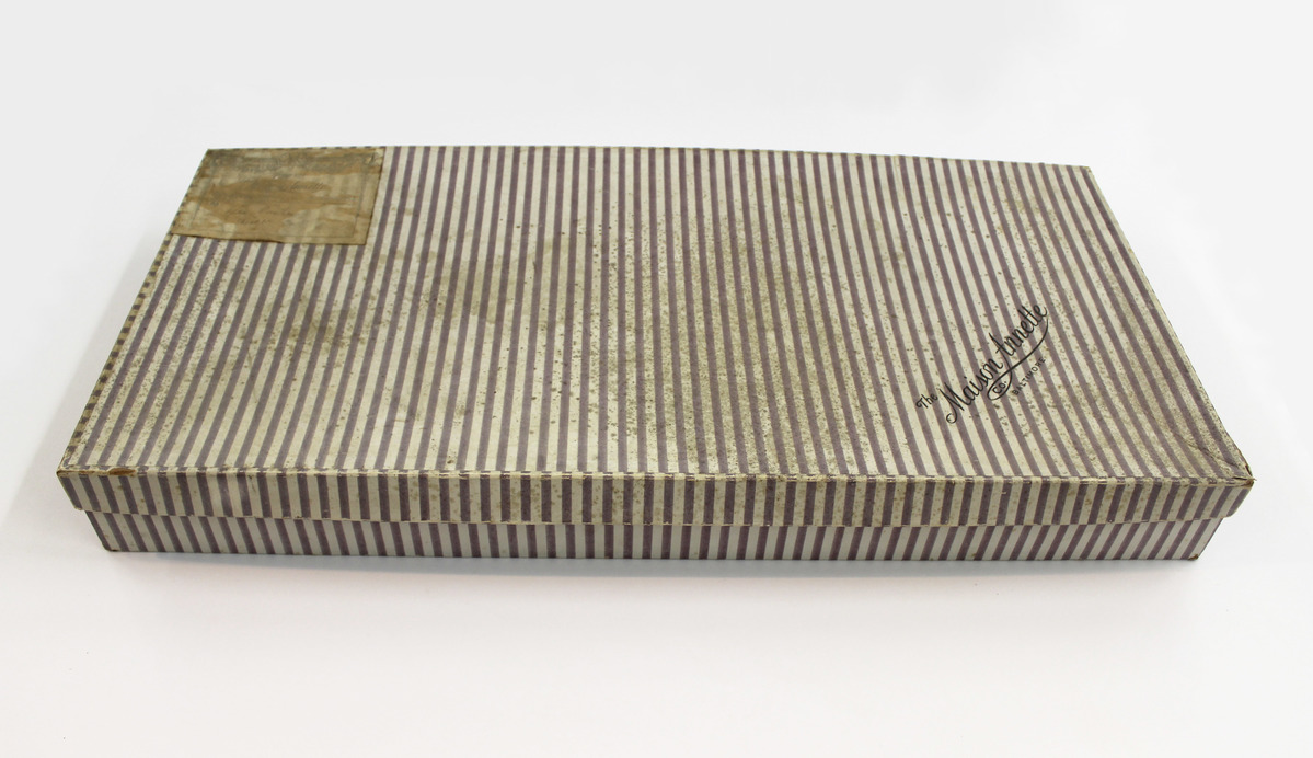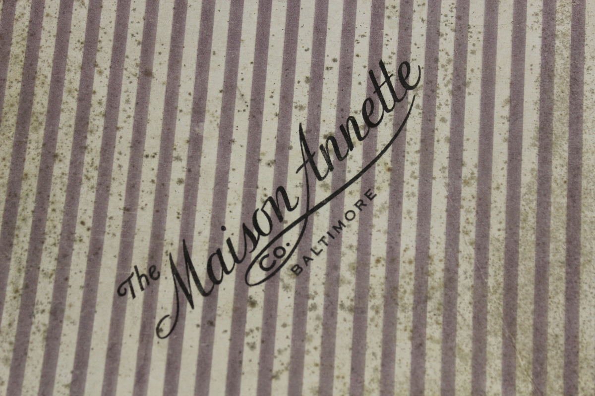 Rectangular cardboard box with alternating purple and white striped paper. Glued to top left of box lid is paper label, "IMPORTERS/THE MAISON ANNETTE/328 CHARLES STREET, NORTH/BALTIMORE, MD/TO_____." Lower right corner, embossed in gold, "THE MAISON ANNETTE CO./BALTIMORE." There are also handwritten notations on side. Cotton ties on box interior.
