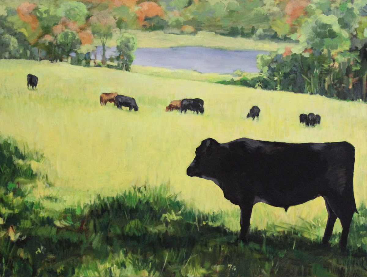 Oil on canvas painting of a cow herd in pasture. Black cow in profile in foreground, standing in tall grass with scattered flowers. Grassy field extends into middle ground, where ten other black and brown cows are grazing. Pasture falls away towards background, where a lake or pond is visible surrounded by trees. Leaves on some of the trees have changed color. Canvas is unframed, with paint continuing around edges where canvas is mounted to stretcher. Artist signature and title on reverse.