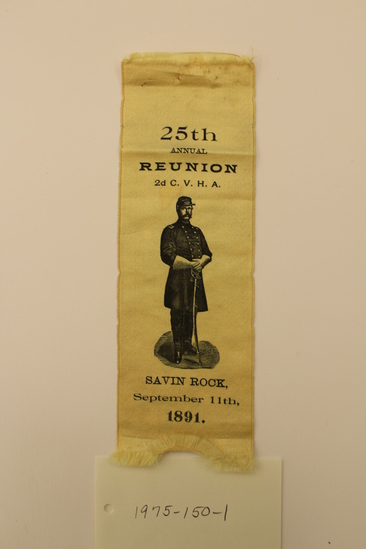 G.A.R. ribbon. Off-white with black printing: "25th / ANNUAL / 2d C. V. H .A. / image of uniformed Civil War soldier with sword / SAVIN ROCK, / September 11, 1891." Straight top with inverted V bottom.