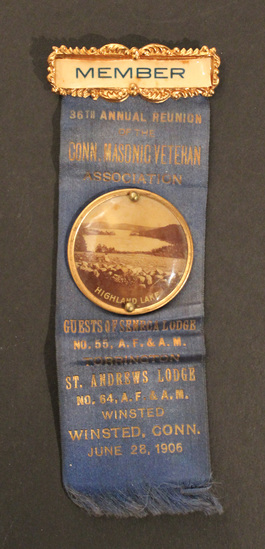 Blue silk ribbon. Gold metal oblong bar at top with decorative scroll edges. Glossy paper printed with "MEMBER" attached to front. Ribbon hangs below bar with photographic button pinned to middle. Photograph shows a lake with "HIGHLAND LAKE" printed across bottom.