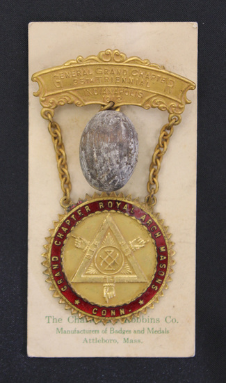 Gold-colored Masonic medal. Oblong bar with scroll decoration at top. "GENERAL GRAND CHAPTER / 35TH TRIENNIAL / INDIANAPOLIS / 1912" stamped across bar. Wooden nutmeg hangs below center of top bar. Gold chain extending down from each side of bar to hang a circular pendant. Red enamel border around outer edge of pendant. "GRAND CHAPTER ROYAL ARCH MASONS * CONN * in gold. Center of pendant stamped with a triangle with Masonic symbols inside. "THE CHAS M ROBBINS CO / ATTLEBORO MASS" stamped on back of pendant. Medal pinned to a cream-colored stiff paper. "THE CHARLES M. ROBBINS CO. / Manufacturers of badges and Medals / Attleboro, Mass." printed across bottom in green.