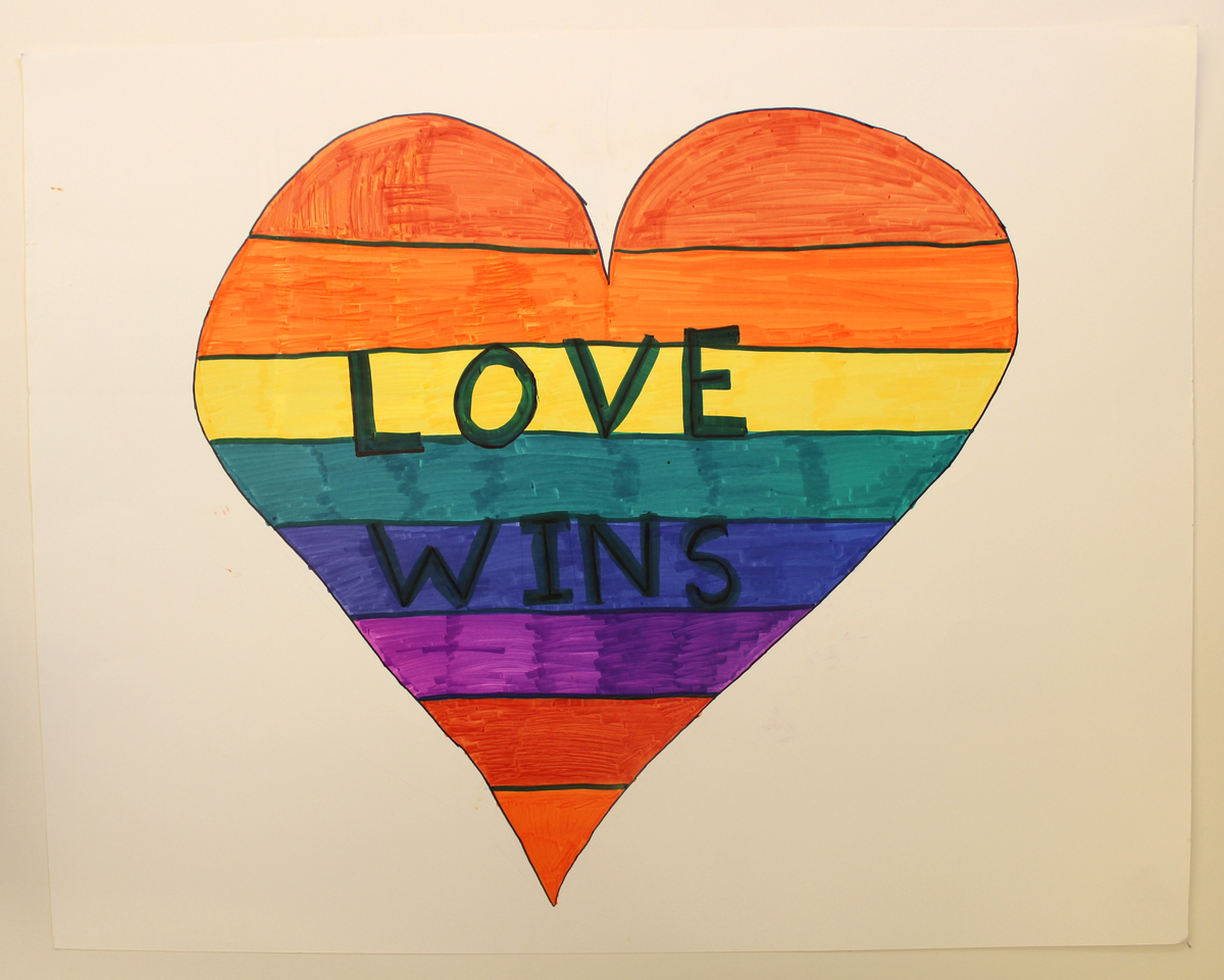 Handmade sign. White poster board decorated with colored markers. At center is a heart shape with horizontal stripes of red, orange, yellow, teal, blue, and purple. Black text overlapping stripes, "LOVE/WINS."