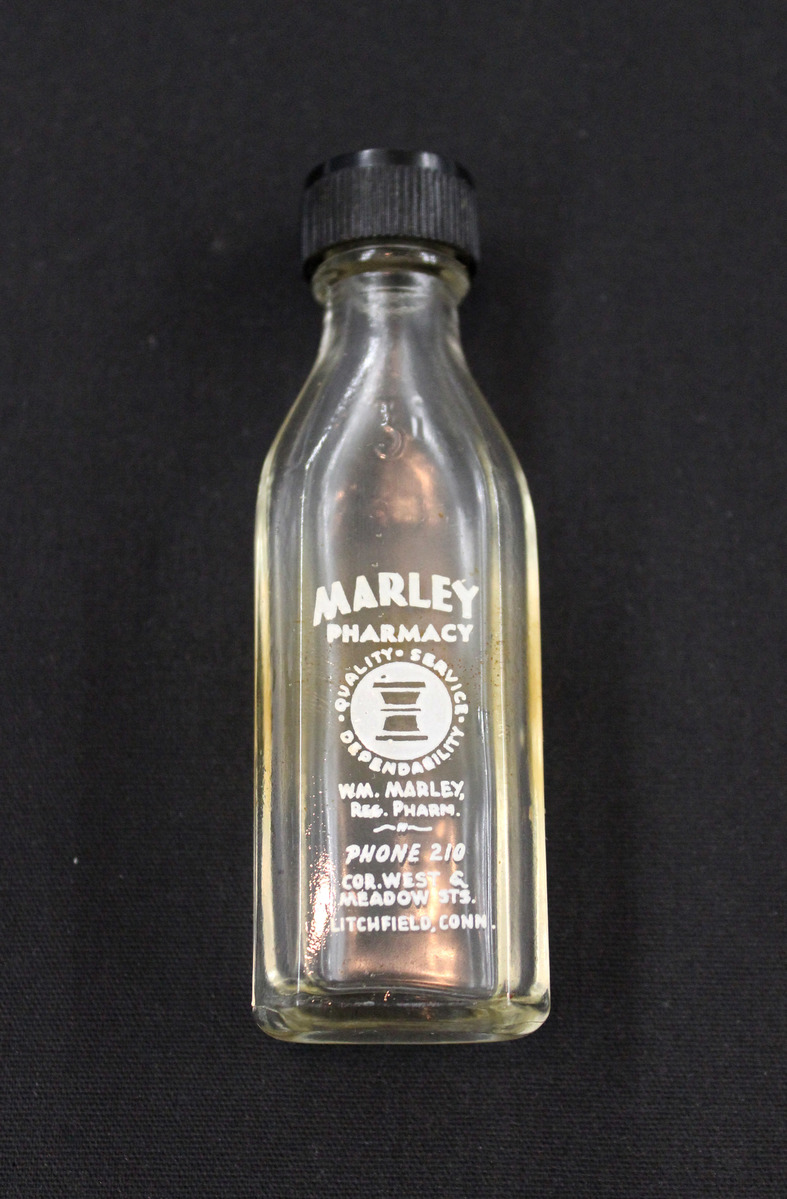 Pressed glass medicine bottle, clear glass with flat front, beveled corners, and rounded back. Short neck with slight rim and threaded top; black plastic cap. Embossed at front-top is a symbol with the letter "i" and at bottom is "Knoxall." White ink on front, "MARLEY/PHARMACY" above symbol of mortar and pestle set in white circle, with text "QUALITY-SERVICE-DEPENDABILITY" around circle; text underneath "WM. MARLEY,/REG. PHARM./PHONE 210/COR. WEST & MEADOW STS./LITCHFIELD, CONN."