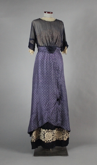Day or evening dress. Purple silk overskirt with white and purple dot pattern. Underskirt black with applied cream colored lace decoration on bottom. Cream colored lace also used at arms and along bust line to decorate an attached cream colored gauze weave bodice. A very thin, gathered black gauze weave overlay covers the arms and bodice. Black silk insert at front of waistband. Decorative buttons at neck. Large decorative button on front, side of skirt.