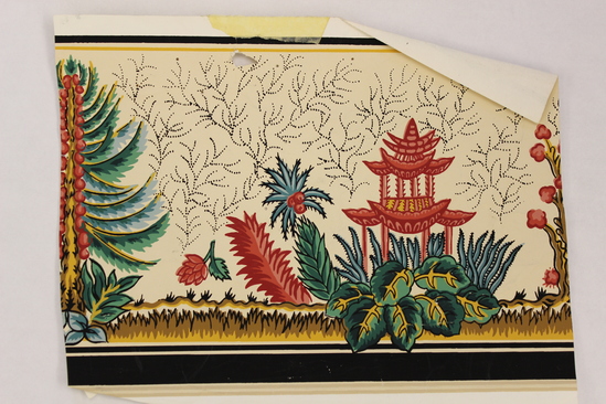 Rectangular wallpaper sample with beige background and a pagoda scene with plants. The pagoda is red and surrounded by green, yellow, and red leaves and trees. Yellow and brown grass runs along the bottom, followed by alternating red and black lines. At the top are horizontal black and yellow lines. Shapes of small black dots grouped around the pagoda.