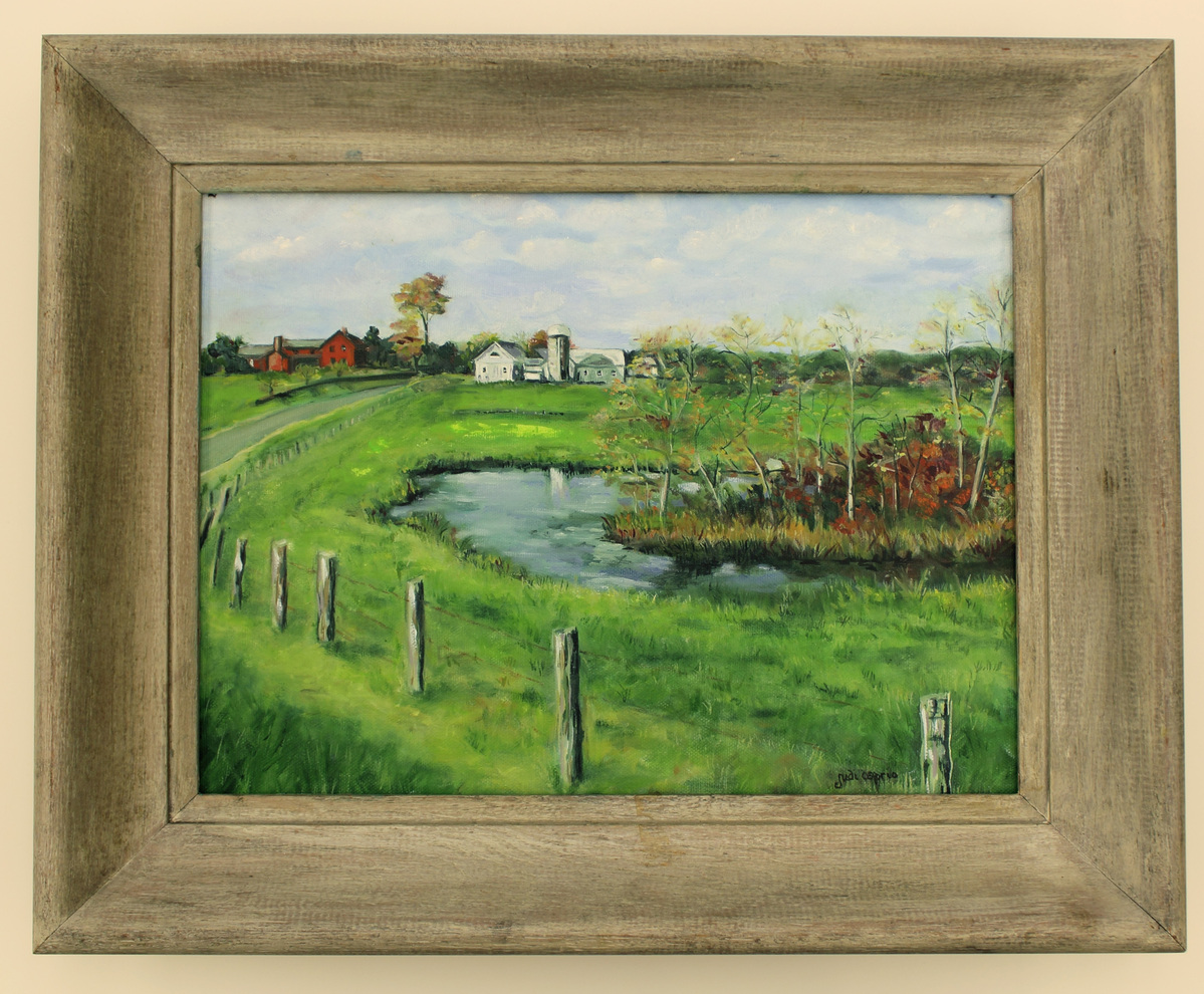 Acrylic on canvas painting of a farm scene. Post and wire fence in foreground, curling to the left and extending into the background. Pond in the middle ground with a lightly forested island in the middle. At the horizon are multiple buildings: a red farmhouse with multiple outbuildings at the left, and a cluster of white farm buildings at the center. Hills are visible at the right, beyond grassy fields. Signed at lower-right, "Judi Caprio." Framed in wood frame with weathered/barn wood finish.