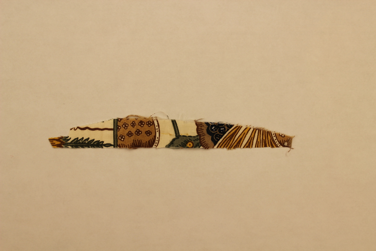 Thin strip of fabric made of cotton. Fabric has a white background with a green, brown, and yellow floral design. Swatch is smooth to the touch. Marks: Attached to invoice with manufacturer information.