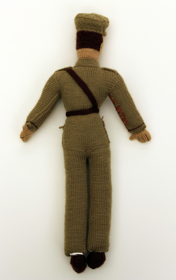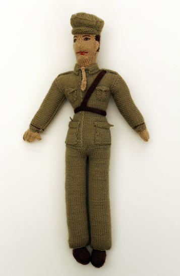 Crocheted doll made of wool yarn and stuffed with cotton batting. Doll shaped like male Army soldier in green uniform with hat, tie, and belt.