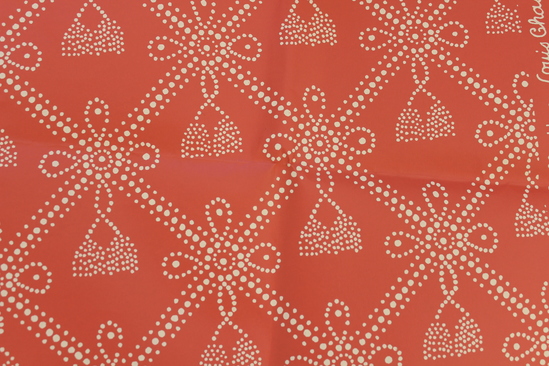 Large rectangular wallpaper sample. Background of red with a large diamond cross-hatch pattern, made up of white dots. At each corner of the diamonds is a bow shape made out of four teardrop-shaped loops and tassels below. "Brunschwig & fils, inc., a screen print collection. Louis Chasset - Paris" printed on the side of the sample. Wallpaper is smooth to the touch.