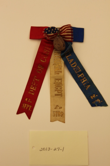 G.A.R. encampment pin. Red, white and blue ribbon tails descending from a red and blue bow with an American flag overlapping at center with a gold metallic ribbon gathering .flag at center with a pendant nutmeg. Each pendant ribbon has gold printing (red ribbon): SEPT. / 6. / DEPT OF CONN," {ivory ribbon): "5 TO 9 / A. / NATIONAL ENCPT." (blue ribbon): "1899. / R. PHILADELPHIA." Paper label on back.