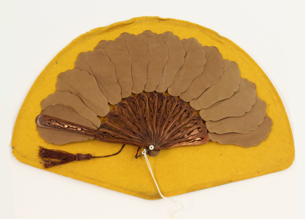 A - Hand fan with carved wooden sticks and silk feathers. Each stick is comprised of a lower section with pierced floral decoration, narrowing at the bottom where they are joined by a mother of pearl button and metal handle with silk cord and tassel. Above the decorated section, the sticks form narrow strips to which are attached individual pieces of brown silk, joined by brown thread. The first and last sticks have wider top sections with the same pierced floral design. The fan is sewn onto a gold felt and chipboard frame backing. B - Gilt wooden frame with rounded molding and a thin strip of decorated molding on the inside edge. Remnants of red paint on frame. Glazing had come loose, but has been repaired. Inside of frame stamped "MADE IN ITALY."