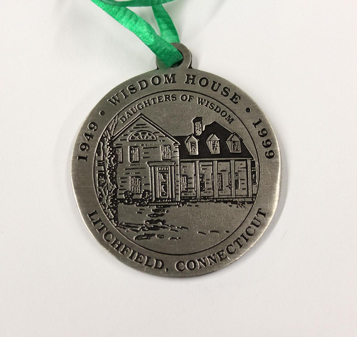 Circular pewter ornament with identical decoration on either side. Features engraved image of a gable-front house with side ell with columned porch, set in thin black border with text, "DAUGHTERS OF WISDOM." Black text above border "1949/WISDOM HOUSE/1999" and below "LITCHFIELD, CONNECTICUT." Small pewter loop at top for hanging; green ribbon tied through loop.