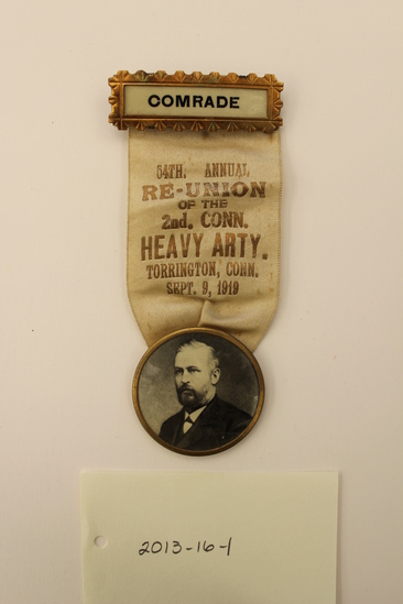 Three-piece G.A.R. reunion medal. Yellow metal bar pin at top with "COMRADE" label. Ivory silk ribbon with gold printing: "54TH ANNUAL / RE-UNION / OF THE / 2ND CONN. / HEAVY ARTY. / TORRINGTON, CONN. / SEPT. 9, 1919." Ribbon gathered into back of a button with a black and white photograph of a bearded man in a dark suit, the commander of the G.A.R. unit at the time of issue. Paper label on reverse of button.