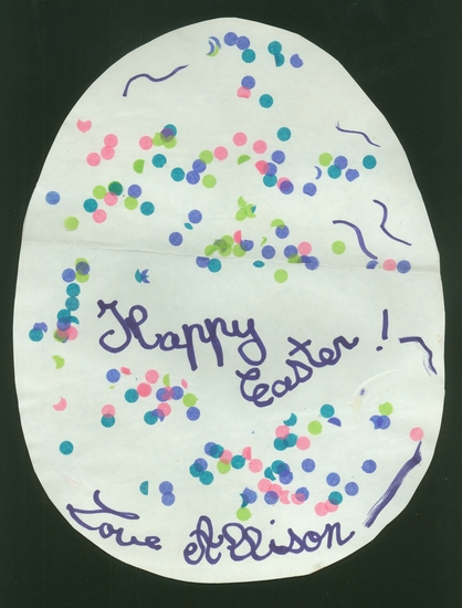 Piece of children's artwork. A piece of plain white paper cut out in the shape of an egg. Small blue, teal, green, and pink tissue paper circles have been glued to the paper to create a collage. Dark blue marker was used to draw squiggle lines throughout. "Happy Easter!/ Love Allison" written in dark blue marker on front.