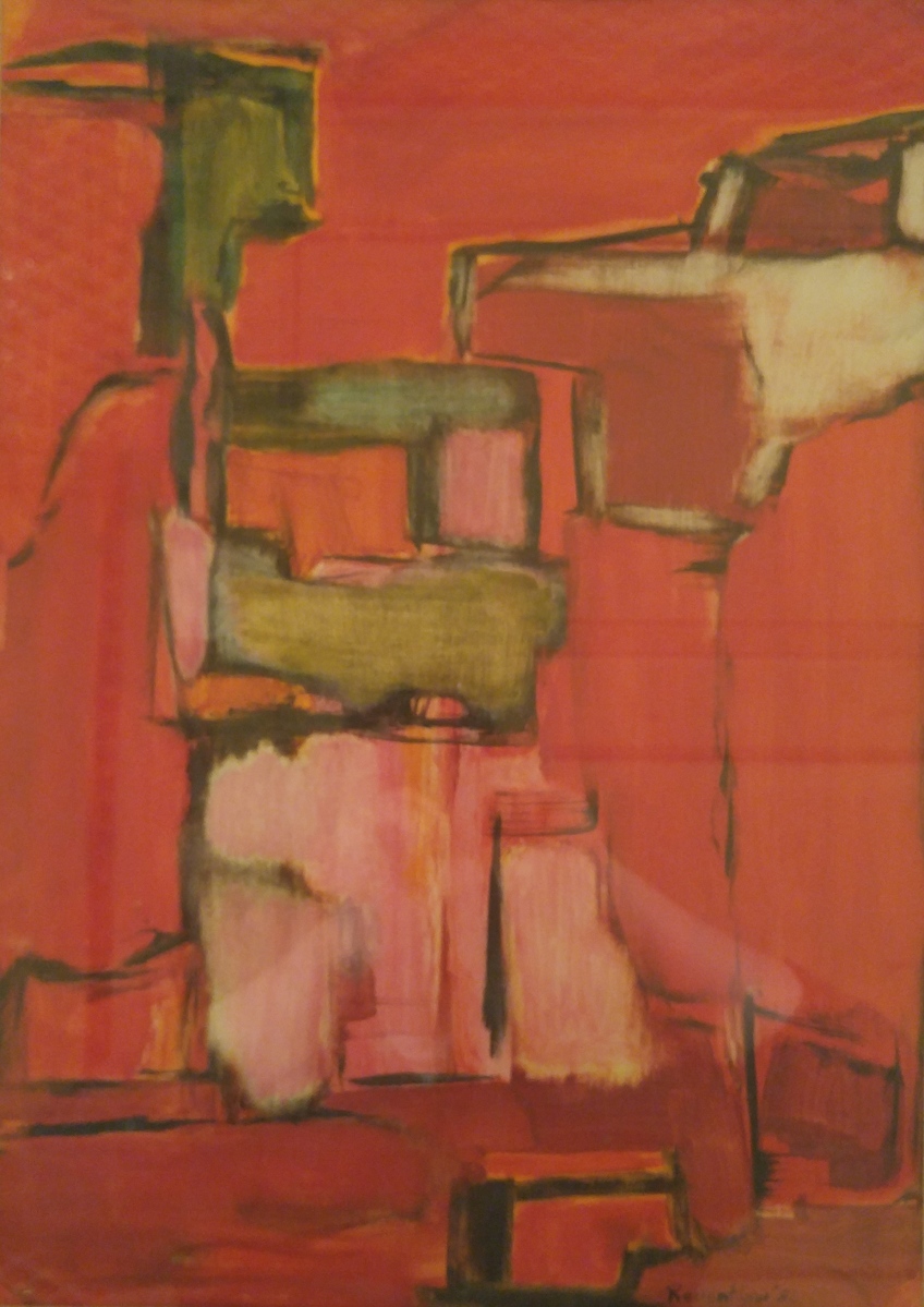 Acrylic or gouache on paper painting of abstract geometric design, featuring rectangular shapes of green, orange, pink, white, teal, and dark red surrounded by large sections of red-orange. Shapes have black outlines of varying widths. Signed in black in lower right "Reventlow '82."