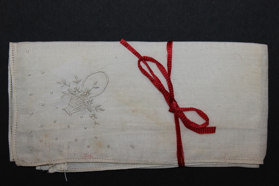 Square ivory linen handkerchief with drawnwork at edge. One corner embroidered with flower basket and french knots. Folded and tied with red ribbon.