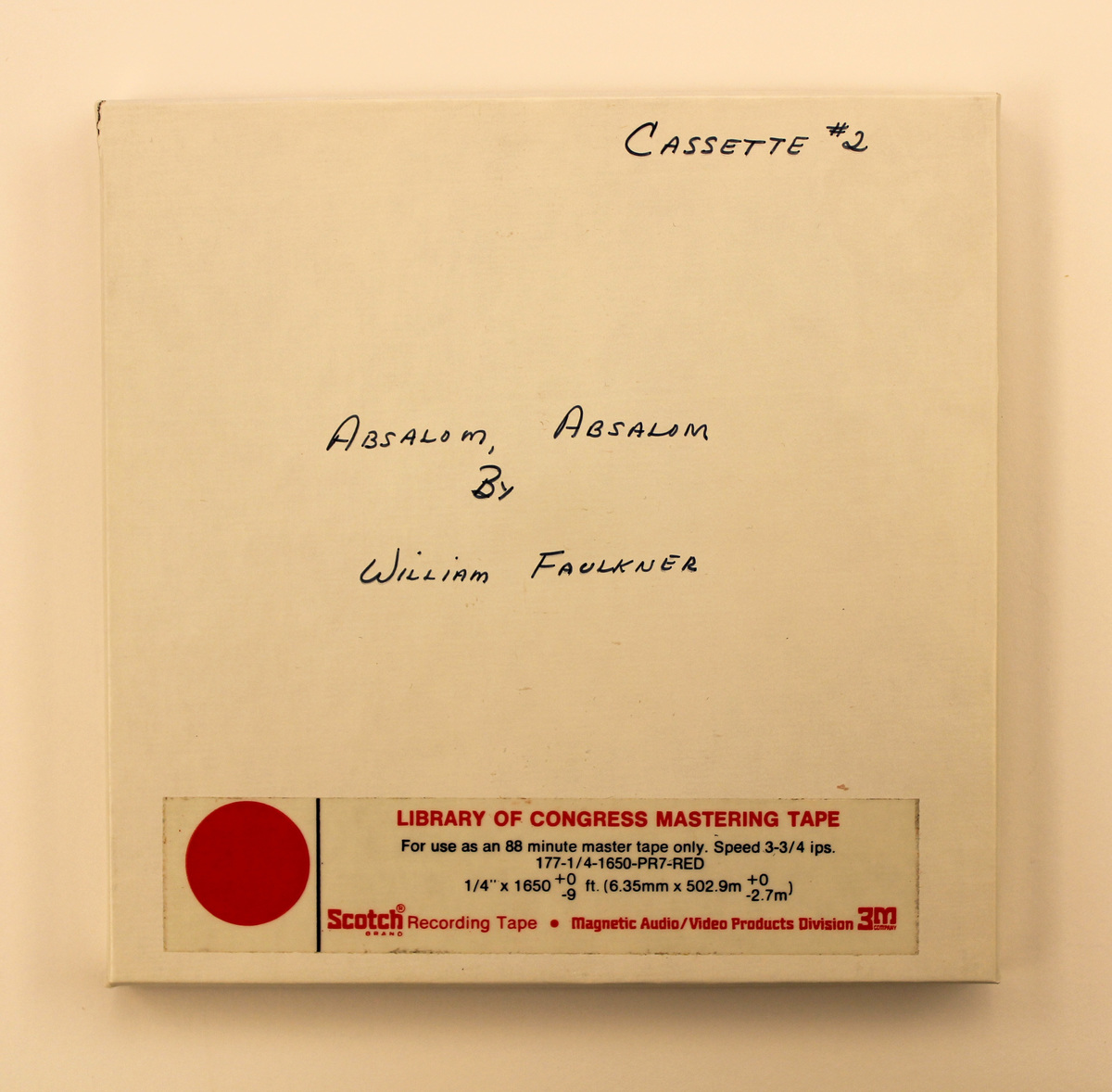Audio recording of William Faulkner's "Absalom, Absalom!" produced by the Connecticut Volunteer Services for the Blind and Handicapped. Open reel audio tape; 1/4 inch polyester tape, 7" diameter reel, 3 3/4 ips speed. Written in blue on on the box front, "CASSETTE #2/ABSALOM, ABSALOM/By/William Faulkner." Written on end of tape, "ABSALOM, ABSALOM CASSETTE #2 SIDE #3." Manufacturer label on front of box, "LIBRARY OF CONGRESS MASTERING TAPE/For use as an 88 minute master tape only."