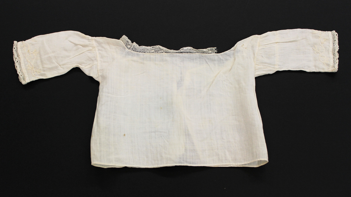 White linen child's undershirt; long gathered sleeves with embroidery and lace; boat neckline with lace edge; open down back with no closures; hand- stitched